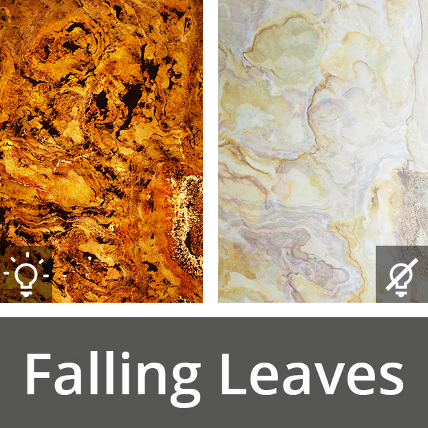 Falling Leaves Luma ist das absolute Designelement, die lichtdurchlässigen Steine verwandelnden jeden Raum in ein einzigartiges Erlebnis der Sinne. Falling Leaves Luma hat dieselben Eigenschaften wie das Classic Material, bis auf die Lichtdurchlässigkeit. Wird das Leuchtmittel hinter dem Falling Leaves Luma ausgeschaltet, wirkt es wie gewöhnlicher Schiefer, wird die Lichtquelle eingeschaltet entstehen einzigartige Musterungen.